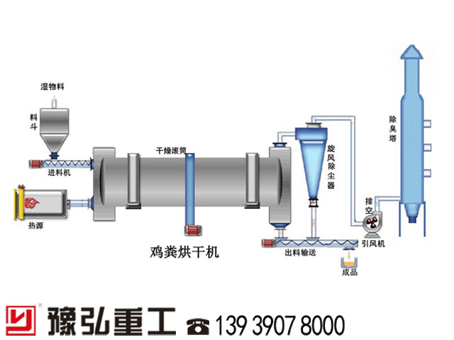 雞糞烘干機(jī)主要由供熱源、上料機(jī)、進(jìn)料機(jī)、回轉(zhuǎn)滾筒、物料破碎裝置、出料機(jī)、引風(fēng)機(jī)、卸料器和配電柜構(gòu)成;脫水后的濕物料加入干燥機(jī)后,在滾筒內(nèi)均布的抄板器翻動(dòng)下,物料在干燥機(jī)內(nèi)均勻分散與熱空氣充分接觸,加快了干燥傳熱﹑傳質(zhì)。在干燥過(guò)程中,物料在帶有傾斜度的抄板和熱氣質(zhì)的作用下,至干燥機(jī)另一段星形卸料閥排出成品。